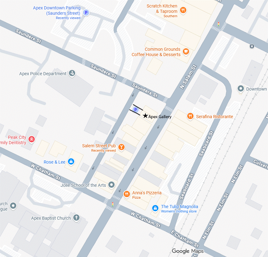 Map of Downtown Apex. Note arrows indicating one way traffic Southbound on both Commerce St and Salem St (between Saunders and Chatham St). See P denoting our gravel parking spot behind the store and the public Saunders St Lot.